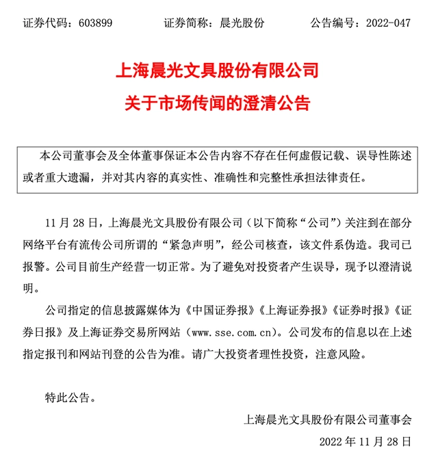 11月28日早上,晨光文具通过官方网站发布声明,经该公司核查,该文件系伪造。公司已报警,目前生产经营一切正常。