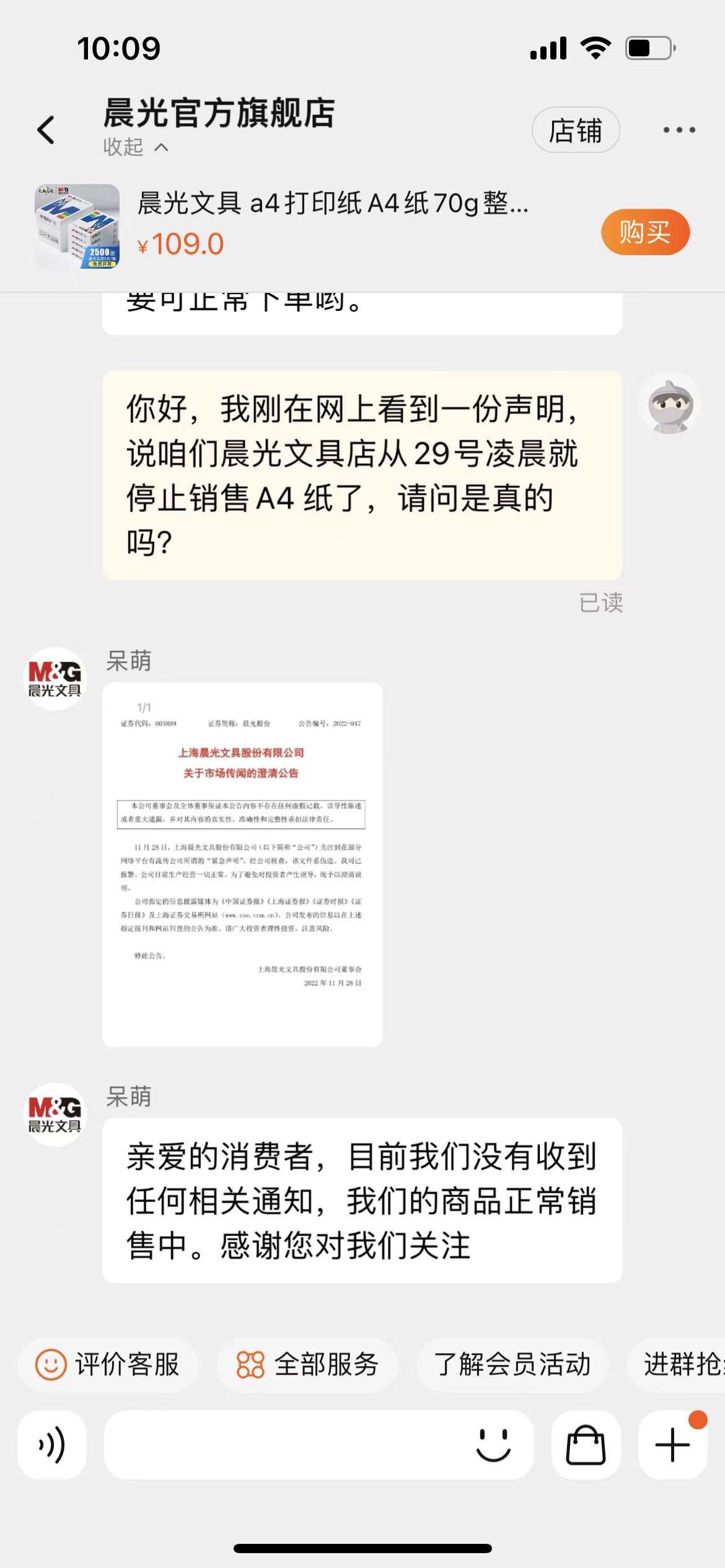 在注意到晨光文具澄清公告后,记者询问该停售声明是否系伪造,客服工作人员表示,“暂时没有收到(澄清公告)这个消息,(停售A4纸)声明是公司发布的,我这边也收到了声明的”。