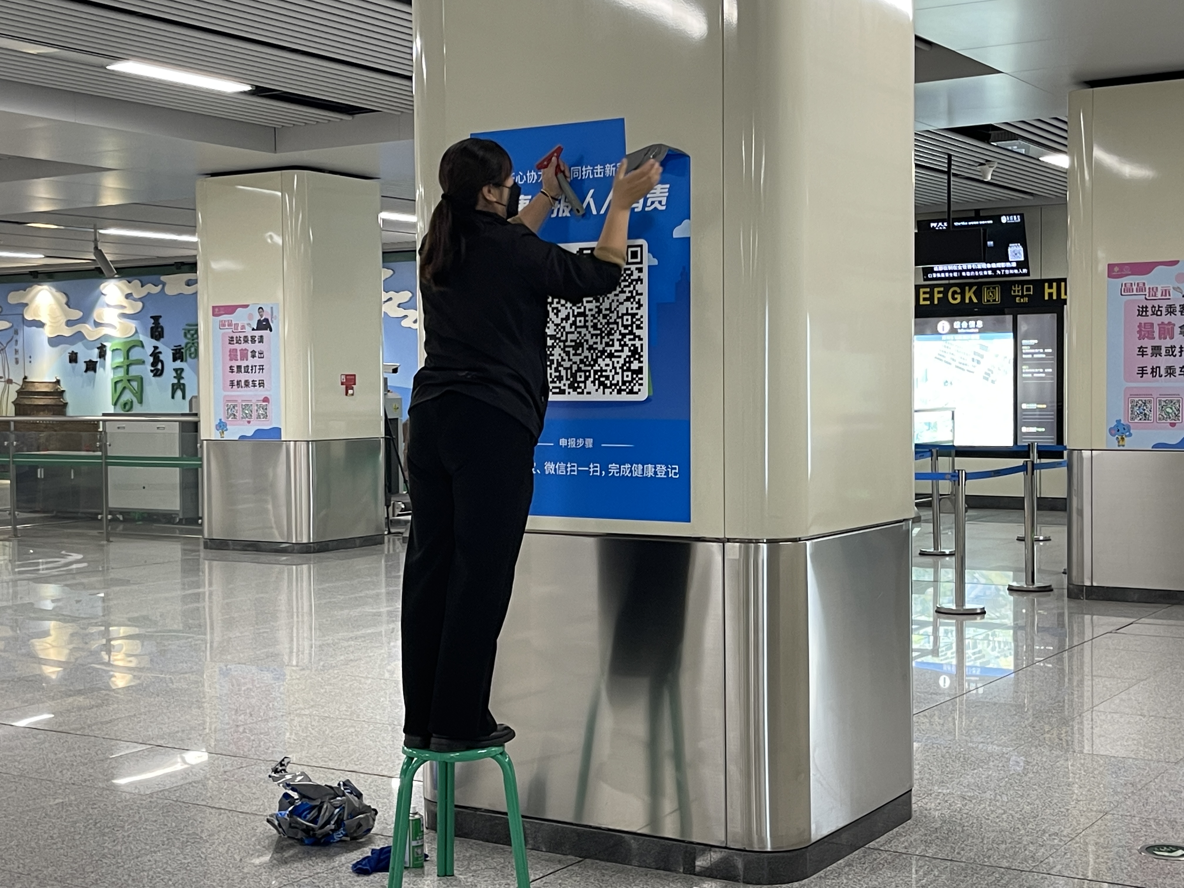 郑州东站地铁站的工作人员正在将扫健康码的标志撕掉。