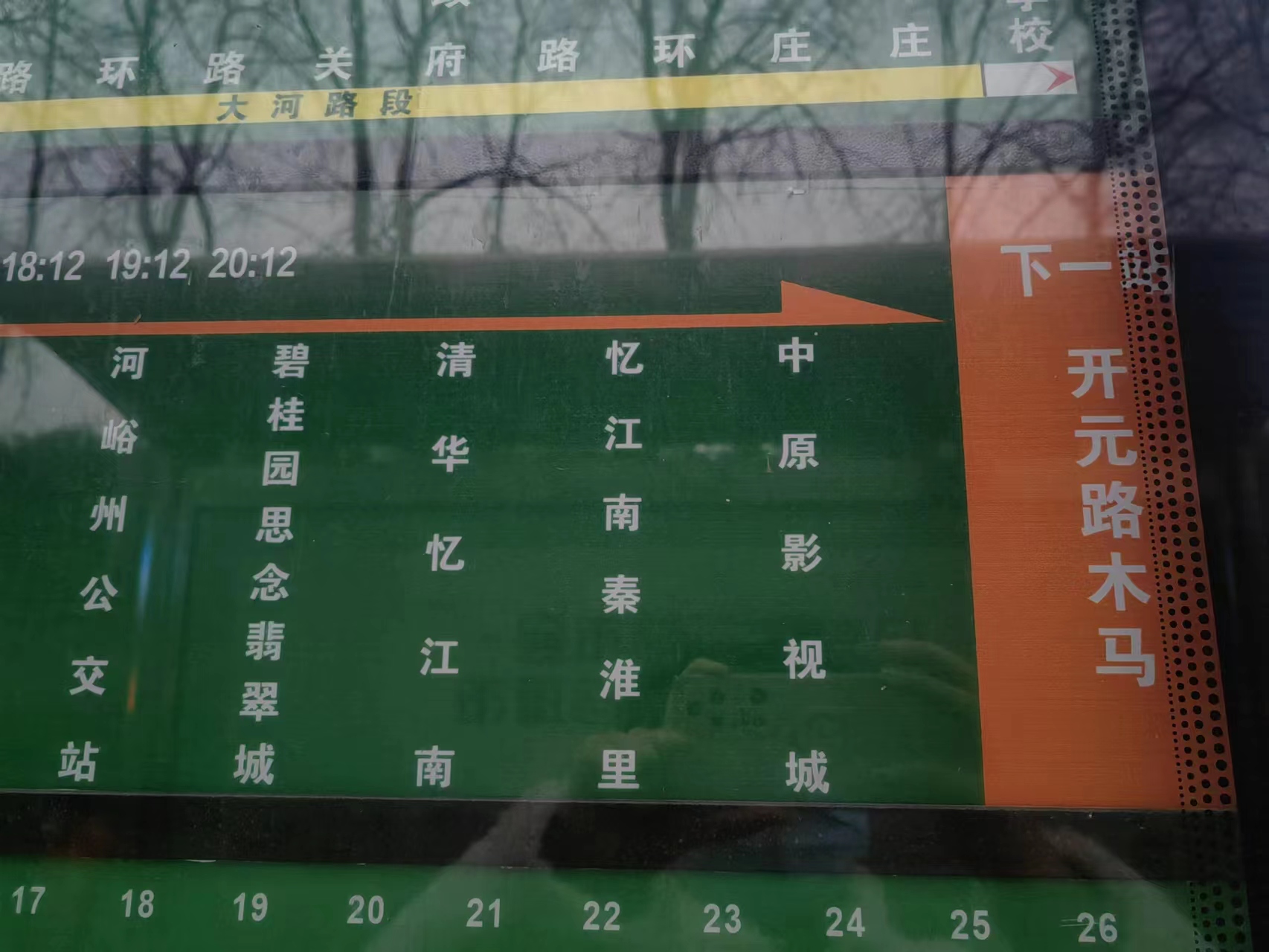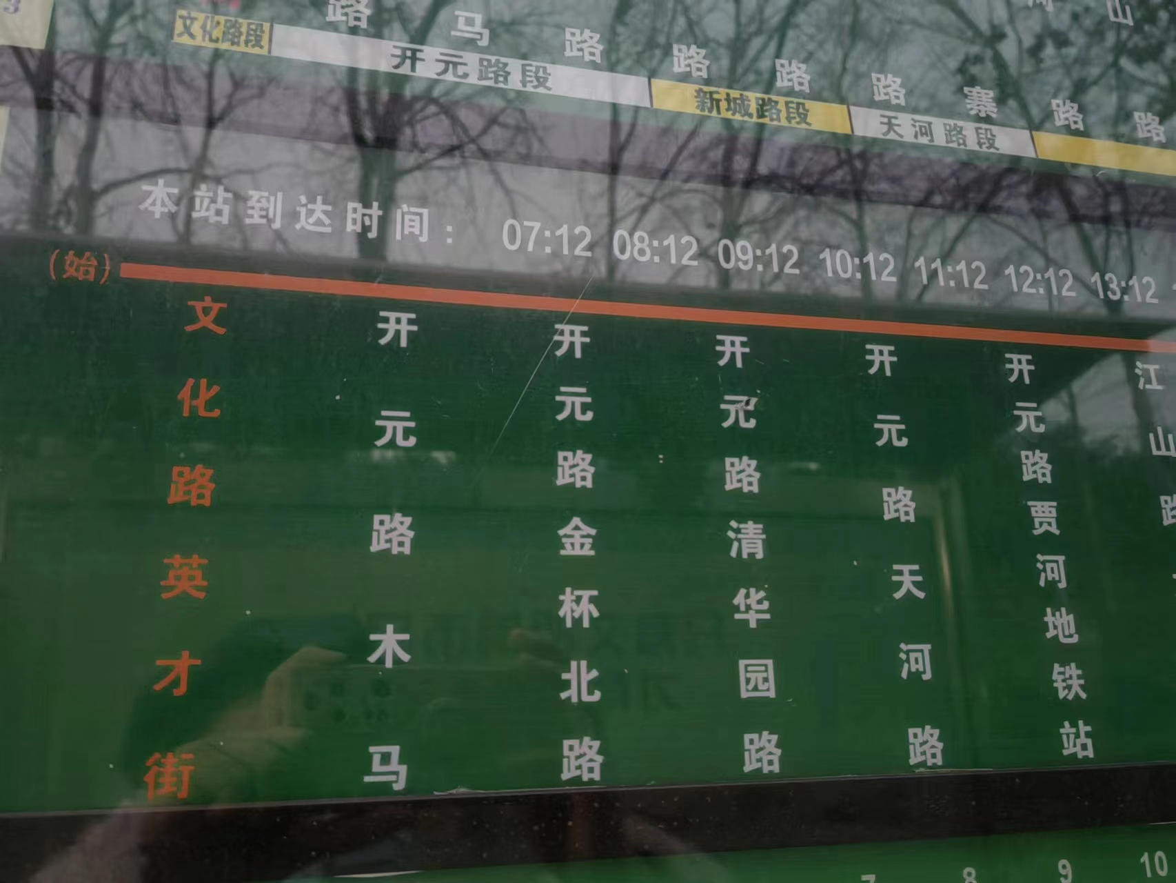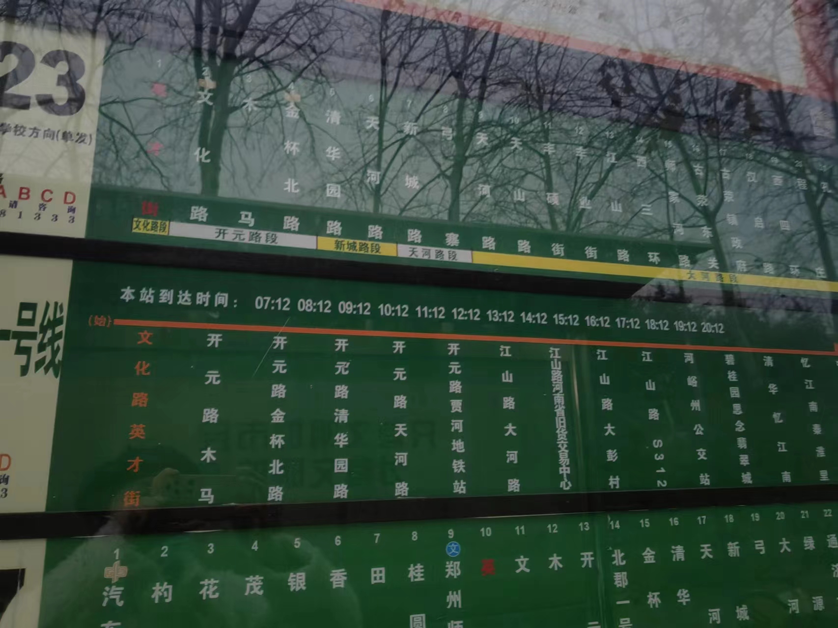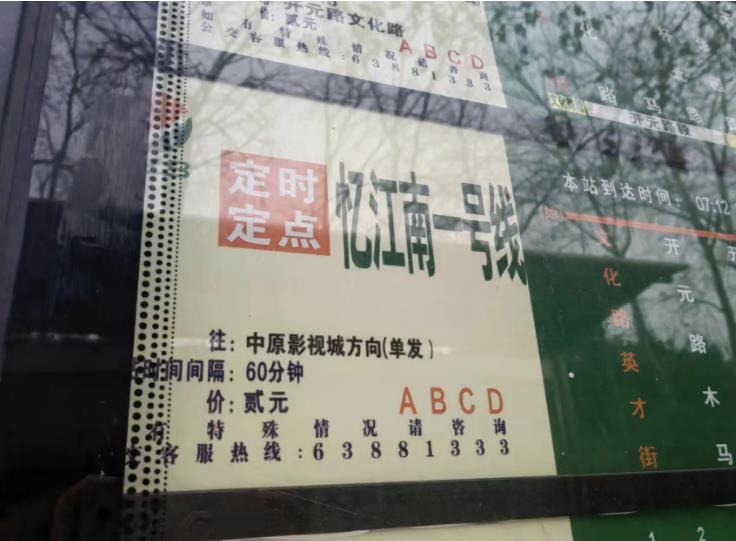 11日傍晚6点,大河报·豫视频记者来到郑州市文化路英才街公交站看到,该公交站点其中一个常规的公交线路提示牌上,有多条公交线路。但唯一不同的是,忆江南一号线这条公交线路被特别标注了“定时定点”几个醒目的字体,该标注采用了红底白字的样式。该线路各站点的最上方,被特别标注了一排全天所有班次车辆到达该站的准确时间(标识上显示:本站到达时间),分别从早7点12分,一下到晚8点12分。