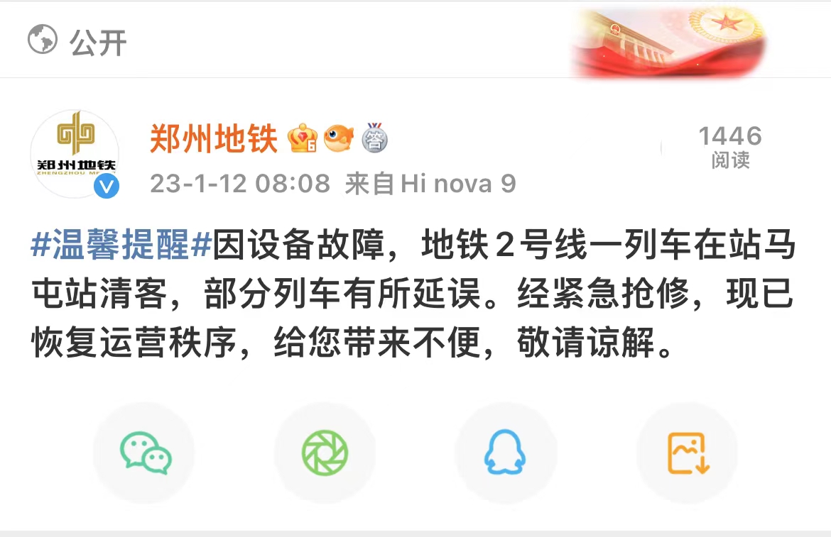 大河报·豫视频记者从郑州地铁集团有限公司运营分公司了解到,早上出现的人流高峰是由于出现设备故障,地铁2号线一列车在站马屯站清客,导致部分列车有所延误,部分列车和车站人流量较大。经紧急抢修,于1月12日早上8:08已恢复运营秩序。