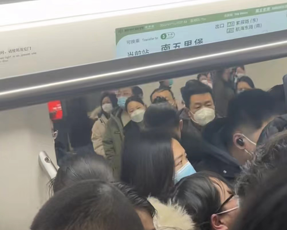 今早,有市民上班时发现郑州地铁2号线的客流量相较往日有所增大。站台上的候车队伍已经快排至对向车厢门口,列车车厢内也是较为拥挤。在地铁2号线和5号线的换乘站南五里堡站,车门关闭时,站台上还站有不少乘客,没有上车。