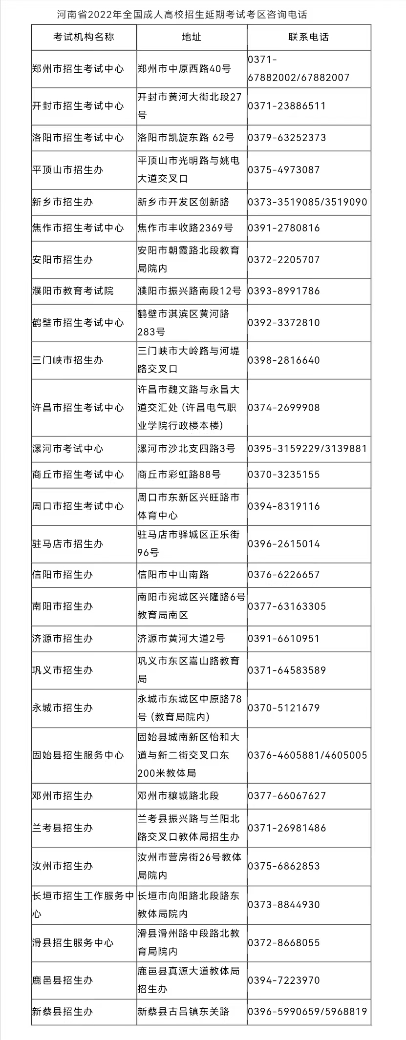 附:河南省2022年全国成人高校招生延期考试各地教育招生考试机构咨询电话