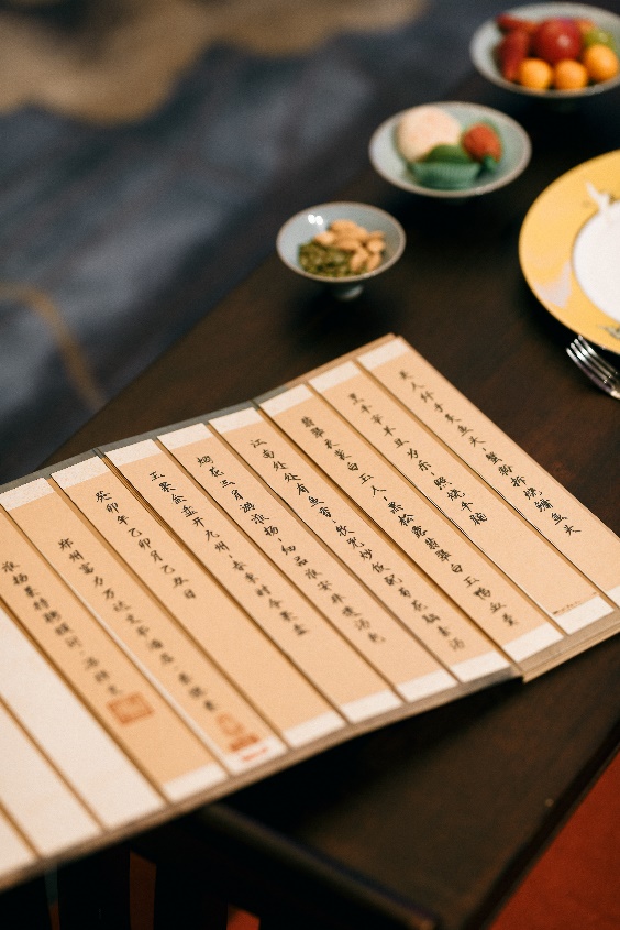 一盏华灯珠钗摇,金樽绮筵淮扬梦。晚宴采取一人一桌的分餐形式,客人着传统服饰,经门楼景观携腰牌入席。服务员着汉服,为客人呈上珍馐淮扬美味。伴随着琵琶轻扬的乐曲,食客们推杯换盏,沉浸在美食与美景之中,感受国风魅力的雅致韵味。