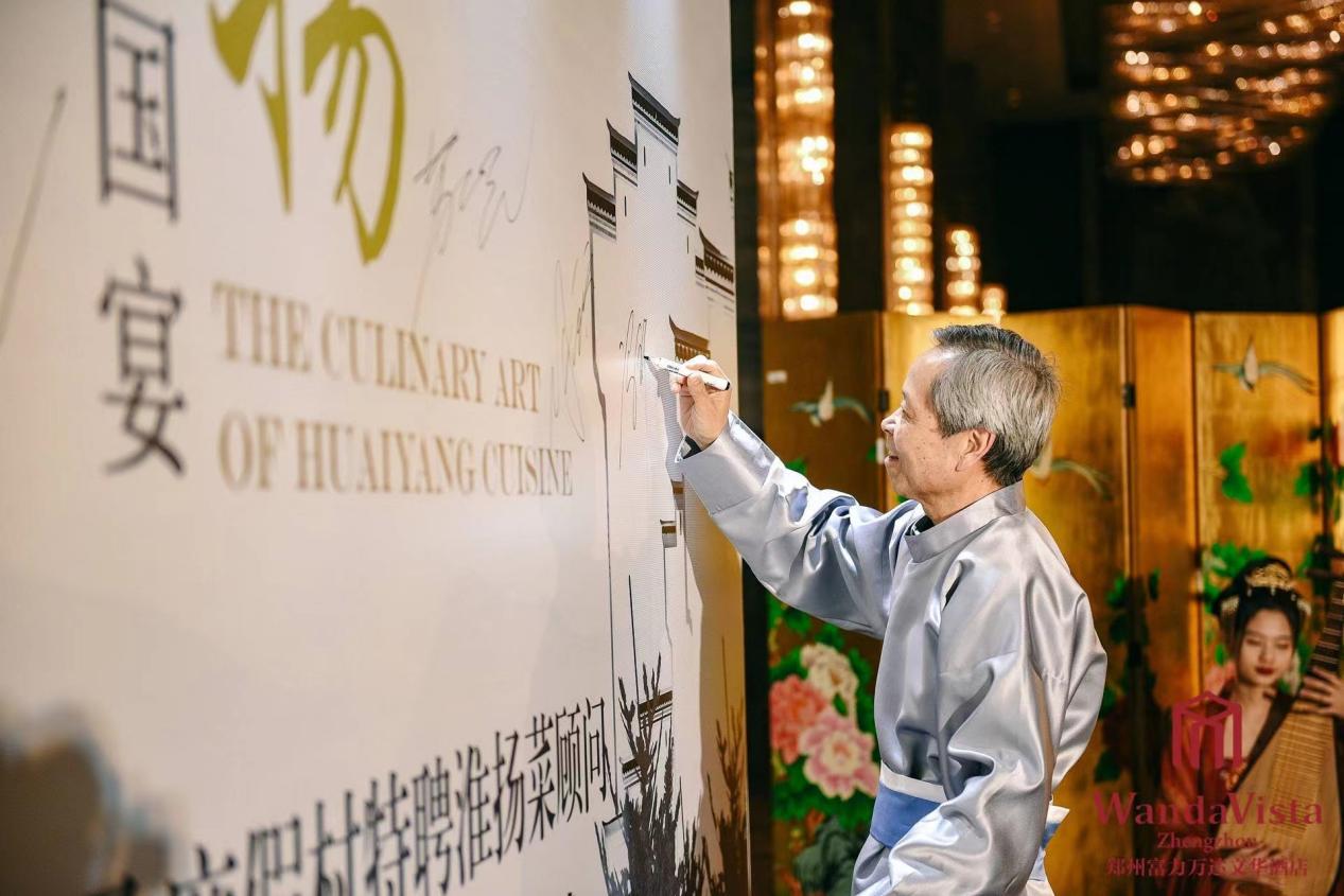 中国,郑州,2023年3月10日—— 2023年3月8日,郑州富力万达文华酒店举行了冯祥文工作室挂牌仪式暨“寻味淮扬 弘扬国宴”郑州站活动。万达酒店及度假村副总裁董军、郑州富力万达文华酒店总经理蔡德来、万达酒店及度假村特聘淮扬菜顾问冯祥文,以及若干名仕会会员出席了本次活动。