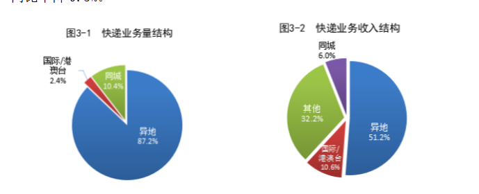 值得注意的是,异地快递业务依然是快递业务最主要的组成部分。1~2月,同城、异地、国际/港澳台快递业务量分别占全部快递业务量的10.4%、87.2%和2.4%;业务收入分别占全部快递收入的6.0%、51.2%和10.6%。与去年同期相比,同城快递业务量的比重下降1.4个百分点,异地快递业务量的比重增长0.9个百分点,国际/港澳台业务量的比重增长0.5个百分点。
