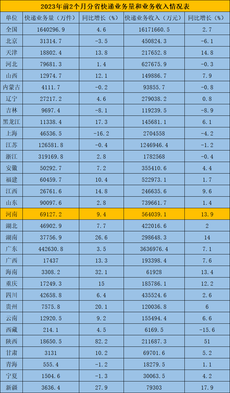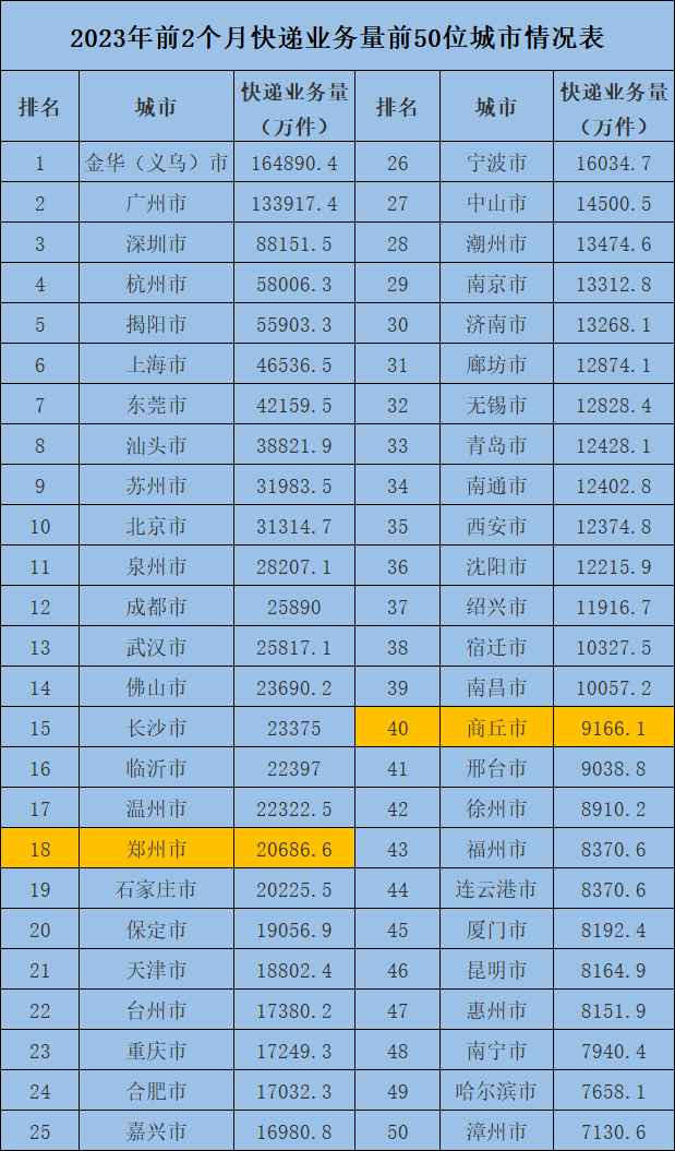 【大河财立方 记者 丁洋涛】3月20日,记者从国家邮政局官网获悉,2023年1~2月邮政行业运行数据显示,全国快递业务量累计完成164.0亿件,同比增长4.6%。河南以69127.2万件快递业务量稳居全国第六,同比增长9.4%,增速高于全国平均增速。在全国快递业务量前50位城市中,河南省郑州市和商丘市上榜。其中,郑州以20686.6万件快递量排名第18,商丘以9166.1万件快递量排名第40。