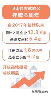 记者3月31日从省自贸办获悉,自2017年挂牌以来,河南自贸试验区累计入驻企业12.3万家,注册资本1.6万亿元,分别是设立前的5.4倍、6.7倍,开放高地建设成效明显。