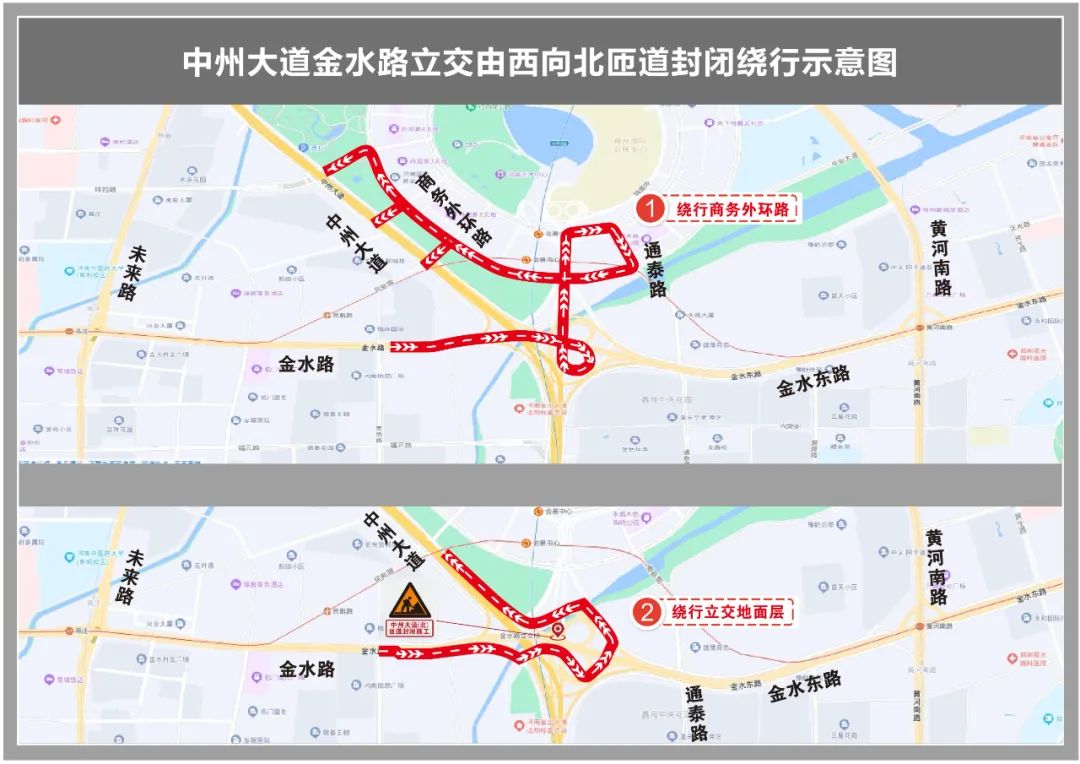 郑州市金水路中州大道互通立交改造工程金水路东向北右转匝道现有桥梁6跨需要拆除,计划于2023年4月15日开始断行全封闭施工,为确保施工期间道路安全畅通,郑州交警提醒广大交通参与者提前选择绕行: