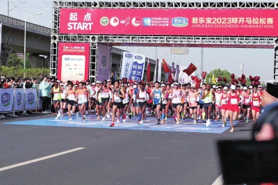 本报讯 昨天上午,2023郑开马拉松赛全程、半程项目在郑开大道白沙服务区准时鸣枪开赛,随后,5公里小马拉松在郑东新区北龙湖欢乐开跑。来自国内外的49000人齐聚一堂,在挥洒汗水、放松身心的同时尽享春色。