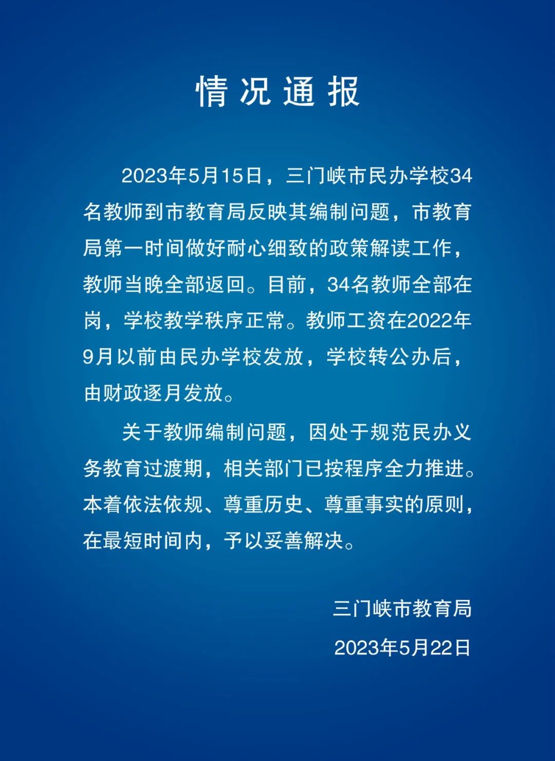 2023年5月15日,三门峡市民办学校34名教师到市教育局反映其编制问题,市教育局第一时间做好耐心细致的政策解读工作,教师当晚全部返回。目前,34名教师全部在岗,学校教学秩序正常。教师工资在2022年9月以前由民办学校发放,学校转公办后,由财政逐月发放。