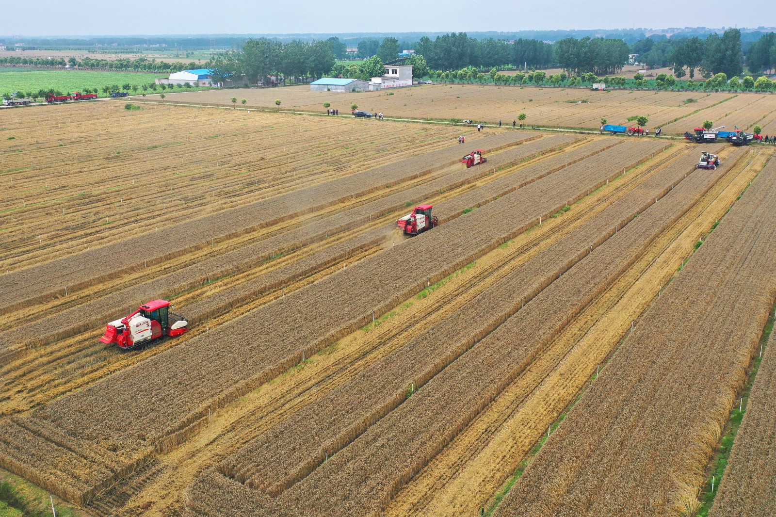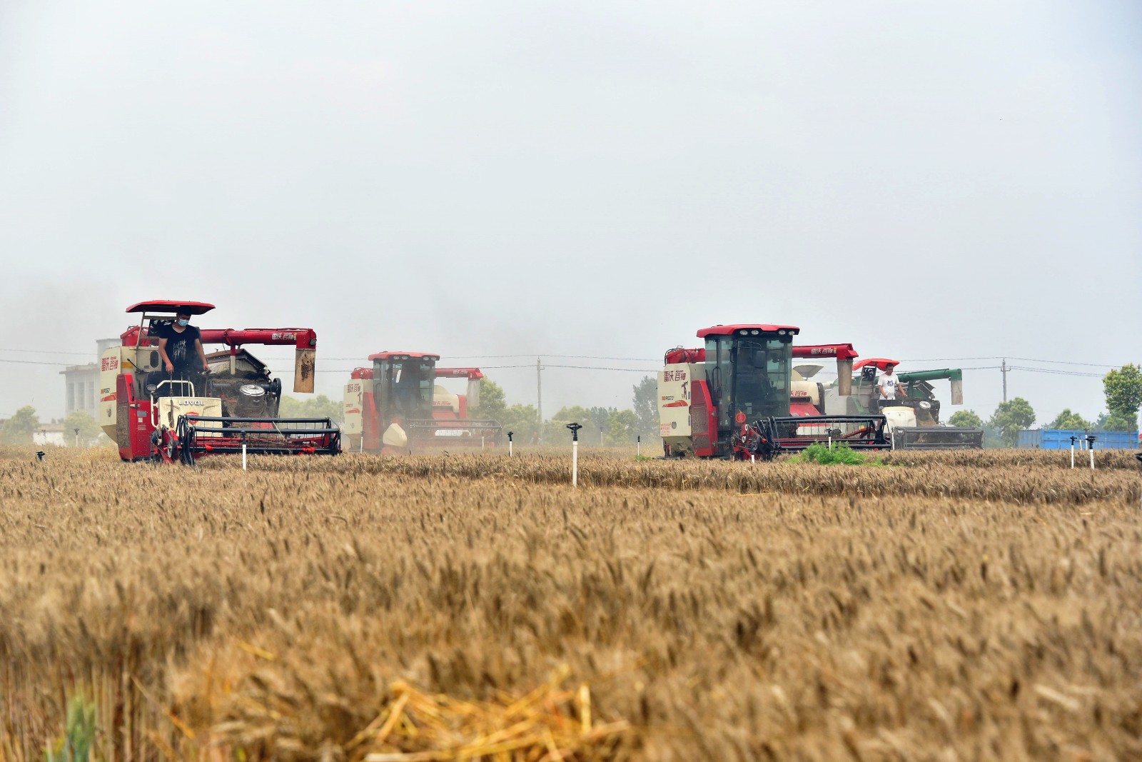 5月30日,在河南省南阳市镇平县,田间地头数台联合收割机、运粮车开足马力,抢抓时节收割小麦,一派繁忙景象。时君洋 摄