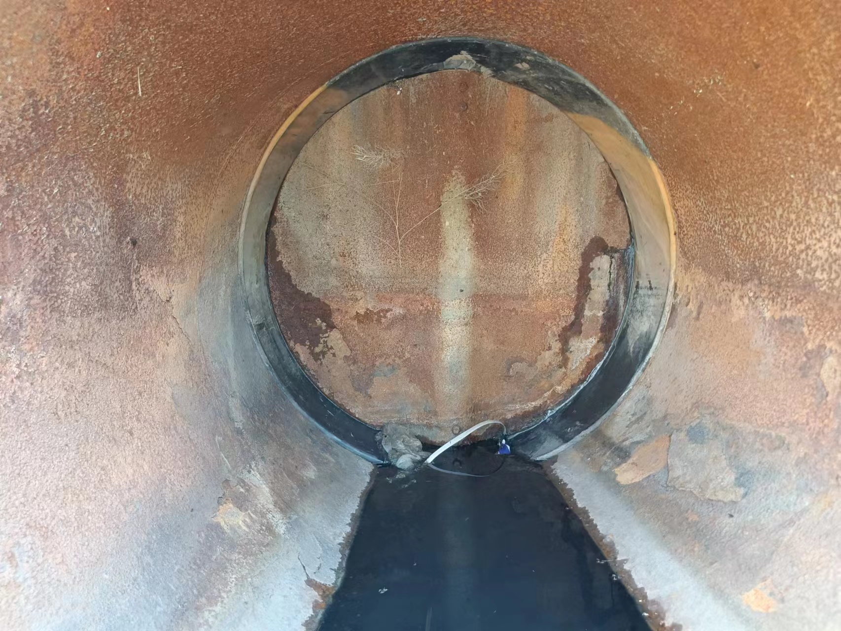在排污口内,一个圆形的阀门将排污口关闭,管道和阀门上也是锈迹斑斑,管道内的积水已经发黑变臭,并伴有塑料袋等杂物,周围蝇虫乱飞。