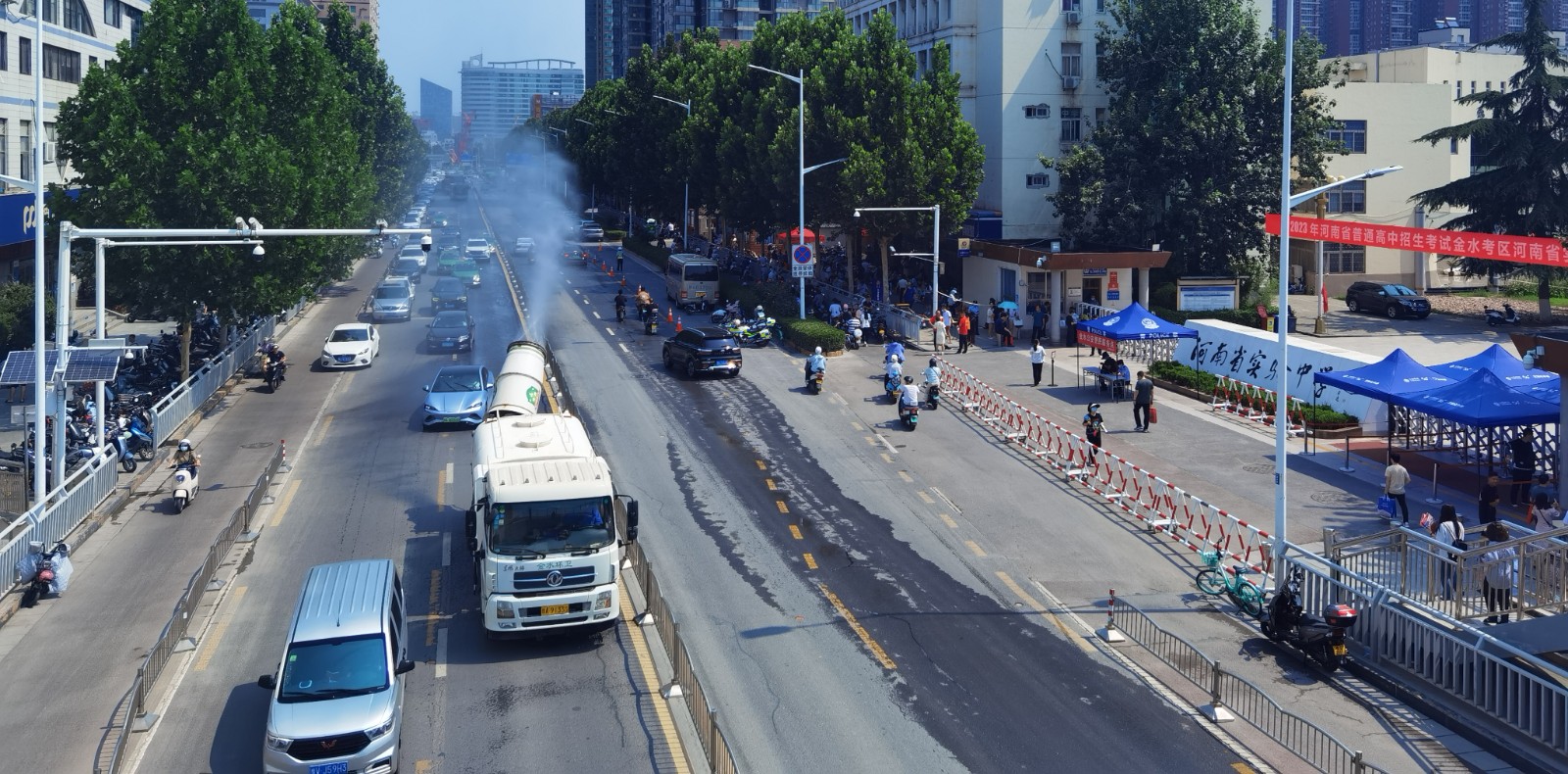 为避免天气炎热影响考生发挥,金水区城市管理局还加大道路清洗次数,中考期间对考场周边道路,采取人工清洗、高压冲洗、洒水、降尘的方式,特别对19个考点周围重点道路进行不间断洒水降温,抑制考场周边扬尘,环卫作业期间,严禁鸣笛,避免噪声,调整机械化作业时间,确保中考期间考点周边交通畅通。