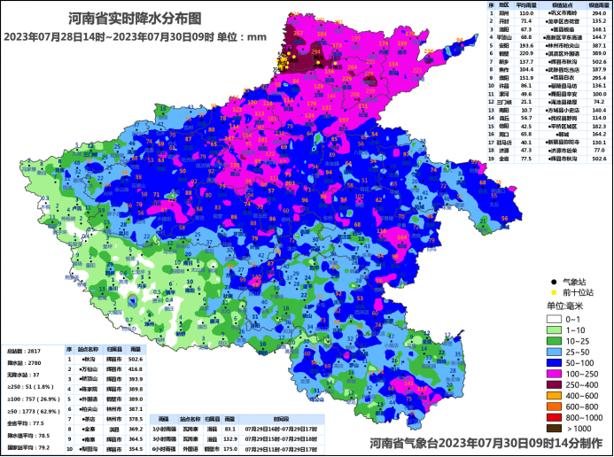 位列前三的分别为:辉县市秋沟502.6毫米、辉县市万仙山416.8毫米、辉县市轿顶山393.9毫米。