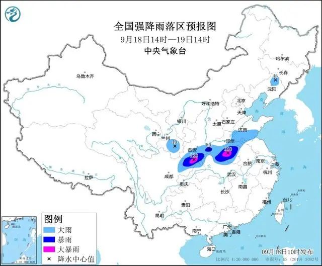预计,9月18日14时至19日14时,陕西南部、四川东北部、重庆北部、湖北北部、河南大部、山东南部以及甘肃南部等地部分地区有大到暴雨,其中,陕西南部、四川东北部、河南南部等地局部地区有大暴雨(100~150毫米)。上述部分地区伴有短时强降水(最大小时降雨量30~50毫米,局地可超过60毫米),局地有雷暴大风等强对流天气。