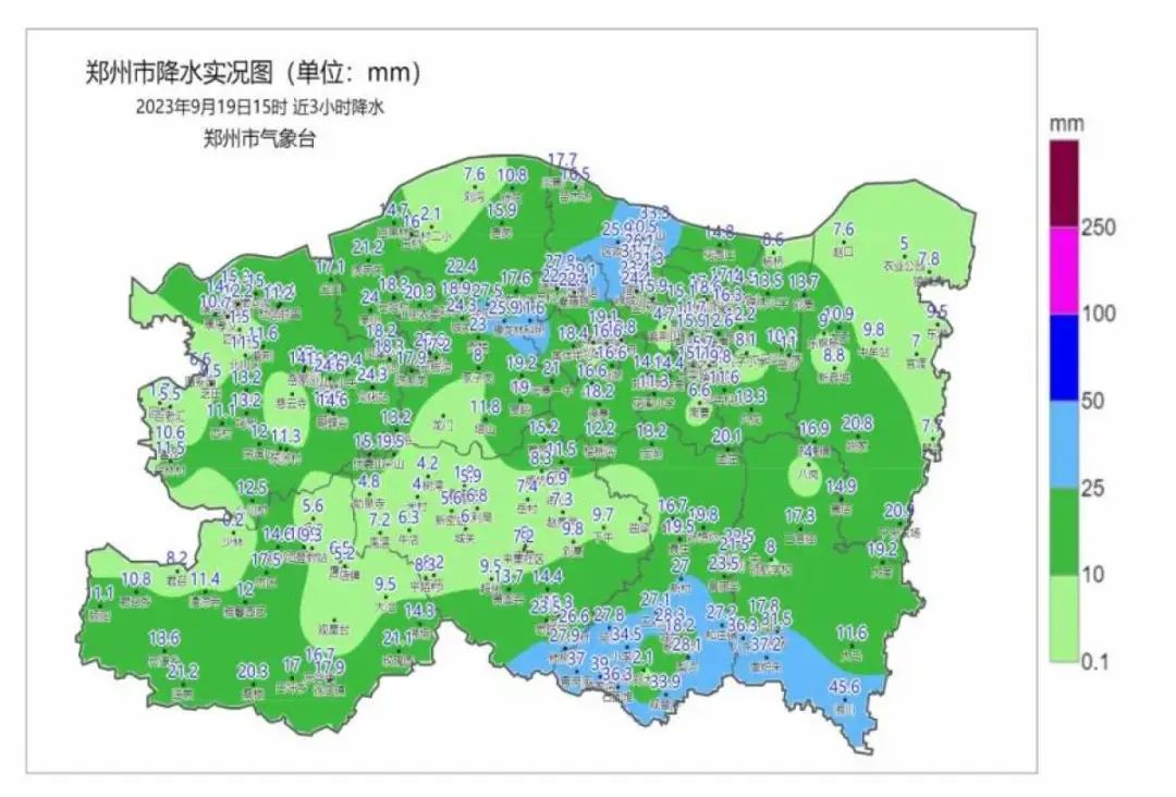 9月19日00时至9月19日15时,郑州市出现中到大雨,局部暴雨。