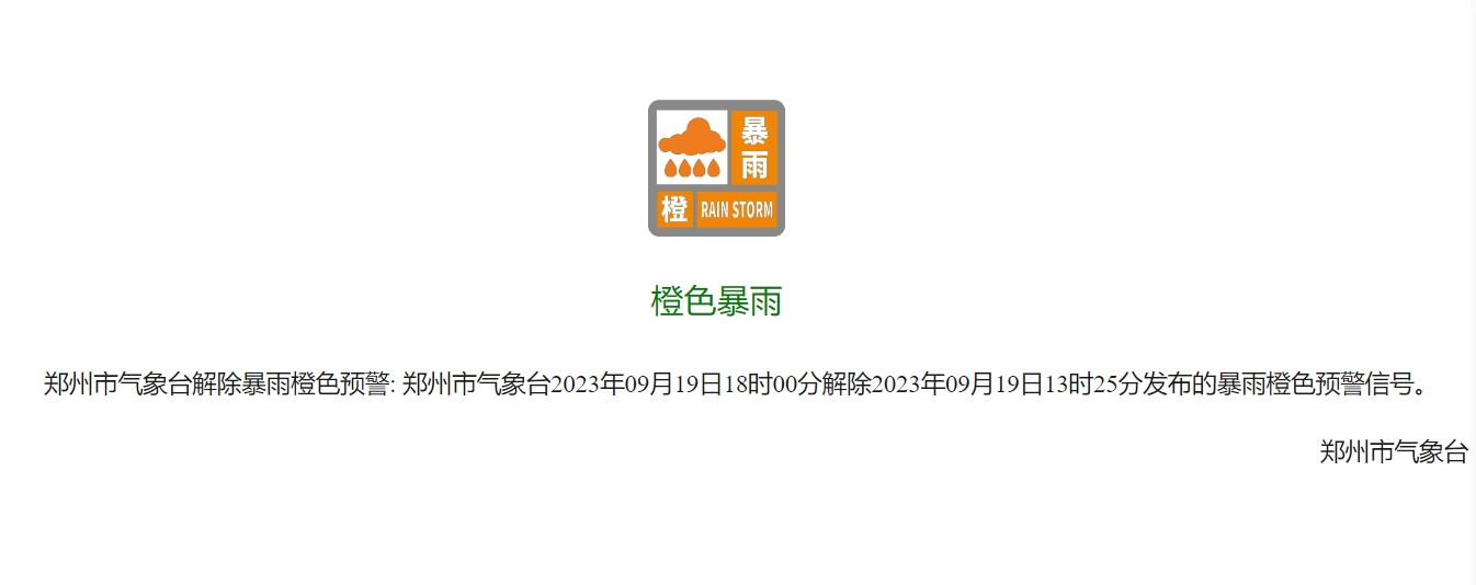 郑州市气象台解除暴雨橙色预警: 郑州市气象台2023年09月19日18时00分解除2023年09月19日13时25分发布的暴雨橙色预警信号。