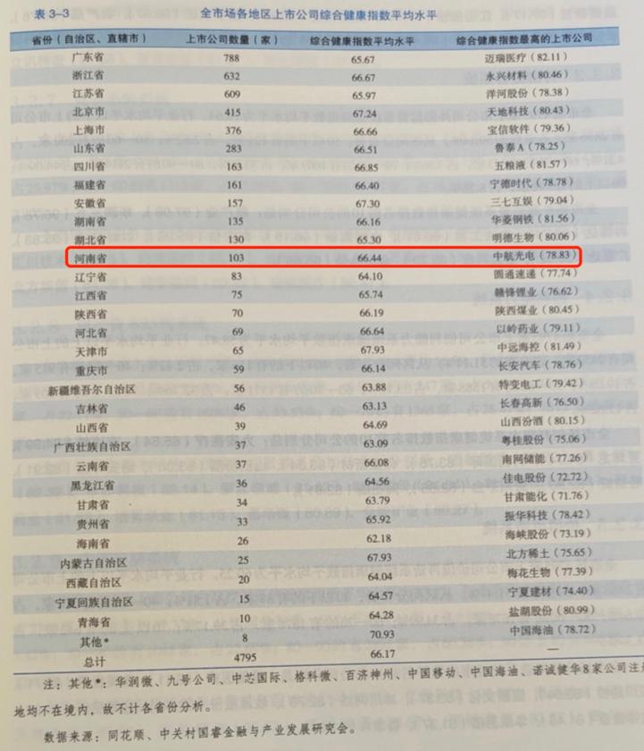 【大河财立方 记者 张克瑶 北京报道】 9月22日,中国上市公司协会学术顾问委员会学术研讨暨中国上市公司健康指数2023发布会在北京召开。根据现场发布的《中国上市公司健康指数报告(2023)》(以下简称《报告》),河南省上市公司综合健康指数平均水平66.44,在全国各地区中排名第12位,位居中上游,其中综合健康指数最高的上市公司是中航光电(78.83)。