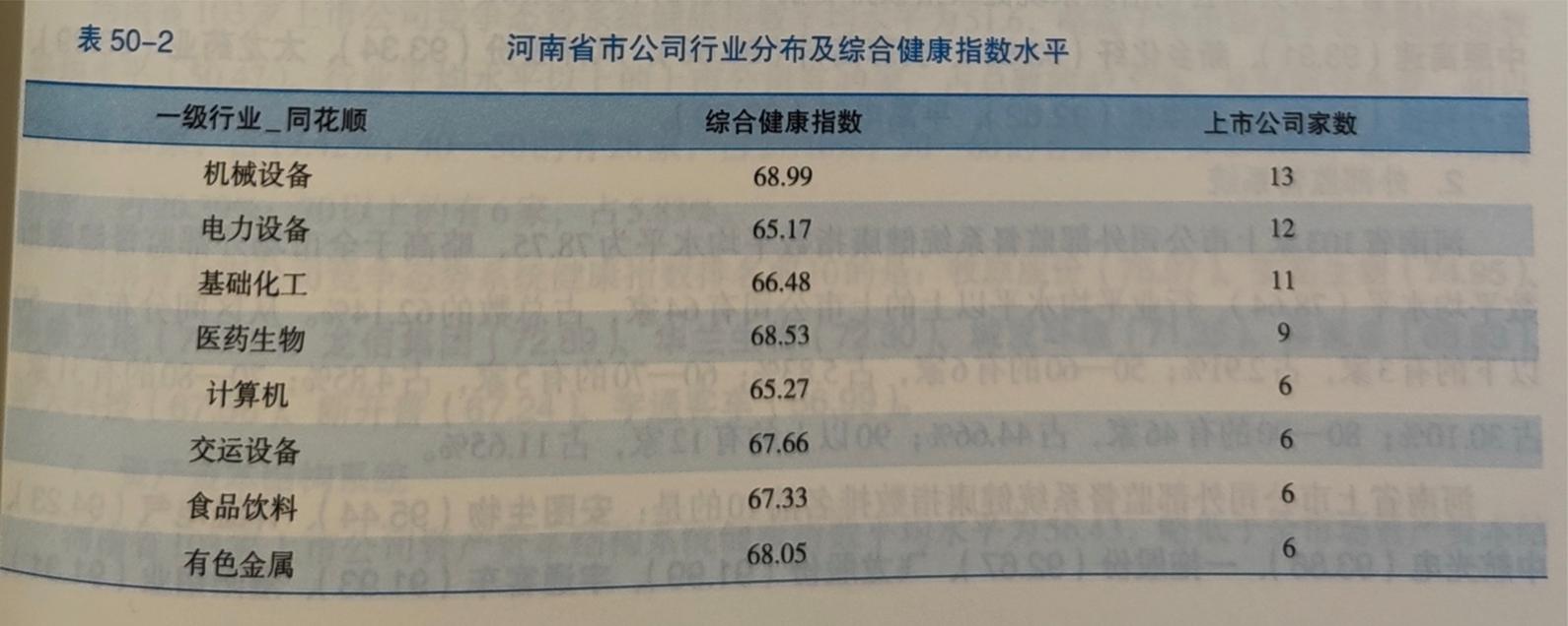 从行业分布来看,河南省上市公司在机械设备、电力设备和基础化工行业均超过10家,医药生物、计算机、交运设备、有色金属和食品饮料行业均为5家以上。在以上行业中,机械设备行业整体综合健康指数水平相对较高,达到68.99。