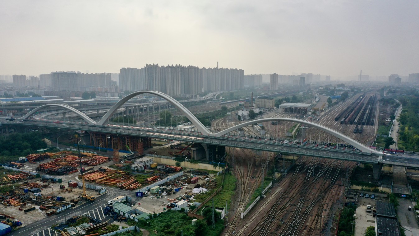 此外,首次在跨越亚洲最大、最繁忙列车编组站同类型最宽涉铁桥建设中实现了钢箱梁和钢箱拱架设、合龙及吊索安装精准无误。