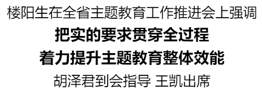 11月4日,全省主题教育工作推进会举行,深入学习贯彻习近平总书记关于主题教育重要讲话和重要指示批示,落实中央主题教育工作推进会精神,听取进展情况汇报,安排部署下步工作。省委书记楼阳生主持并讲话,中央第九巡回指导组组长胡泽君到会指导,省长王凯出席。
