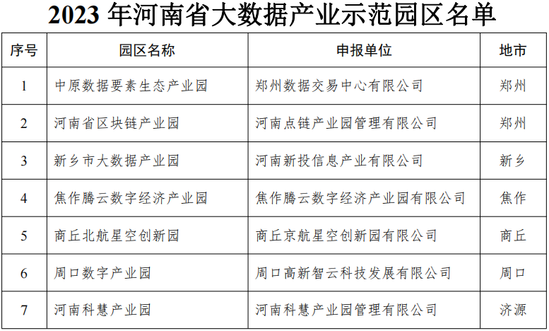 【大河财立方消息】11月21日,河南省工信厅公布了2023年河南省大数据产业示范园区名单,确定郑州数据交易中心有限公司“中原数据要素生态产业园”等7个园区为2023年河南省大数据产业示范园区。