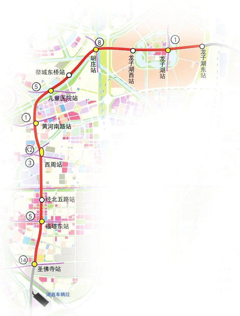 该线路起于经开区圣佛寺站,止于郑东新区龙子湖东站,串联郑州经济技术开发区、郑东新区黄河南路片区、龙子湖高校园区。线路全长16.538千米,均为地下线路,设车站11座,其中换乘站7座,设河西车辆段1座。