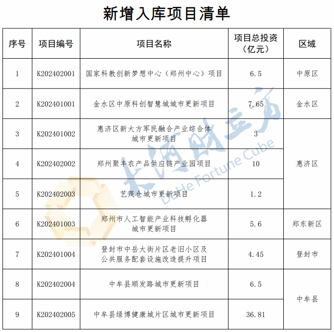 【大河财立方消息】 3月26日消息,郑州市城市更新工作领导小组办公室近日调整城市更新项目库,国家科教创新梦想中心(郑州中心)等9个项目通过评审并完成社会公示,纳入城市更新项目库。