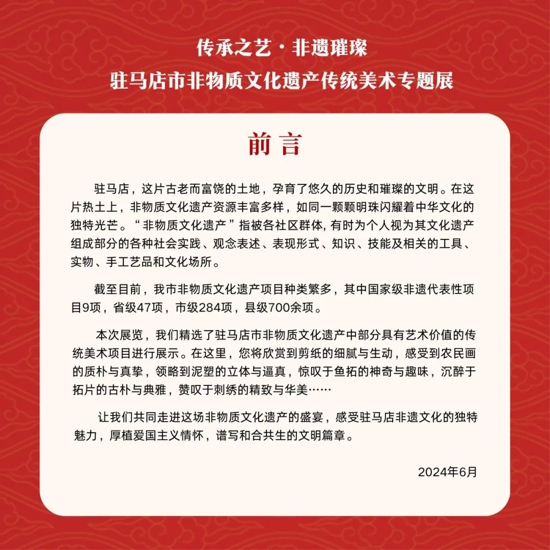 2024年6月8日是“文化和自然遗产日”。为丰富人民群众精神文化生活,集中展示我市非遗保护成果,增强全社会的非遗保护意识。6月7日至6月12日,我市各区县线上线下百余场非遗宣传展示活动将同步开启,一批极具驻马店文化底蕴的非遗技艺将集中亮相,2024年“文明实践乡村行 非物质文化遗产推介官”、2024驻马店市非物质文化遗产系列专题展,非遗购物节、非遗进校园、进景区、进社区,传统医药义诊等一系列围绕非遗的展览、公益课堂、研学等活动将接力开展,全方位展现驻马店的文化底蕴和非遗的魅力,让非遗产品“飞入寻常百姓家”。