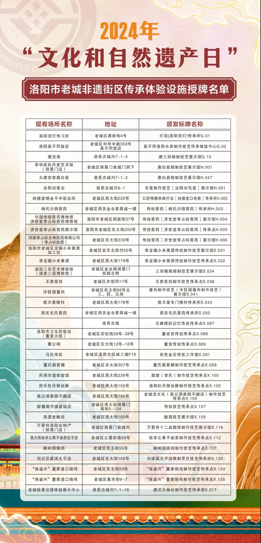 其中,位于老城区的35个传承点位被授牌,其中包含洛阳宫灯传习所、洛阳真不同饭店、唐宝斋等。