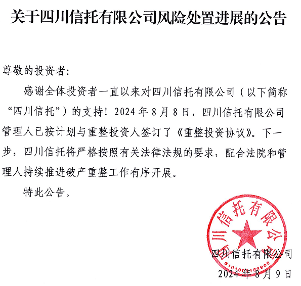 公告提到,8月8日,四川信托有限公司管理人已按计划与重整投资人签订了《重整投资协议》。下一步,四川信托将严格按照有关法律法规的要求,配合法院和管理人持续推进破产重整工作有序开展。