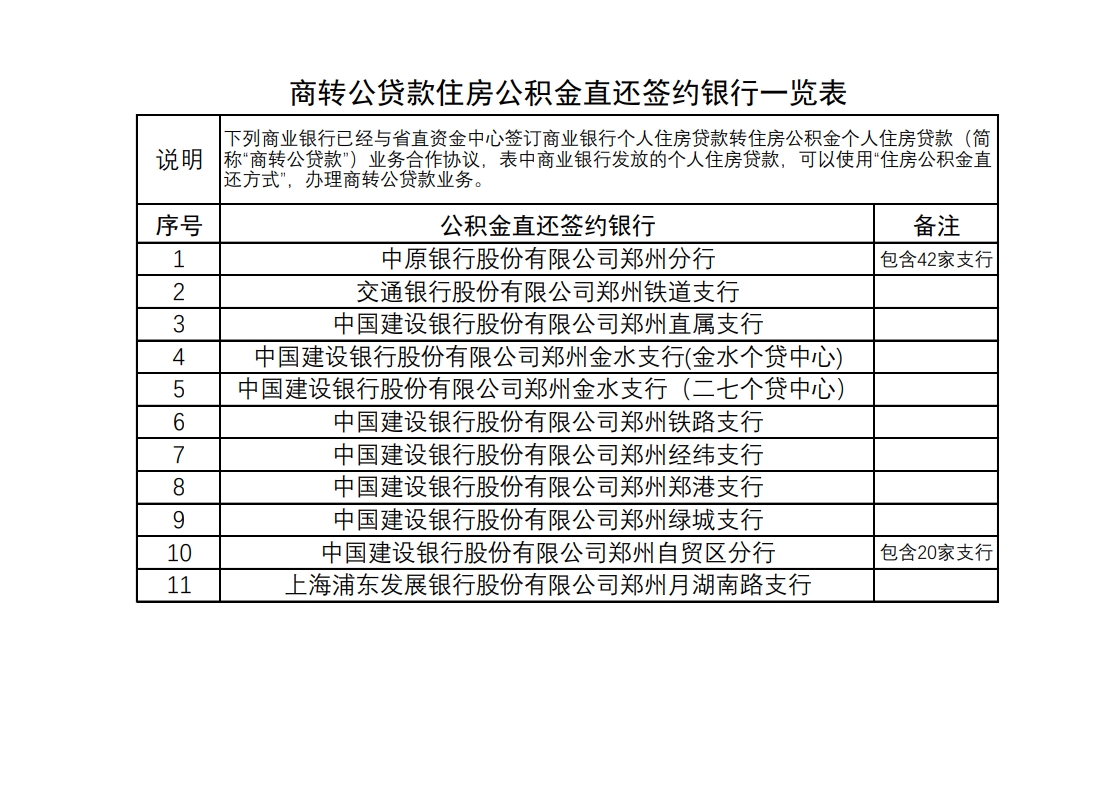此次公布的直还签约银行一览表中,具体包含:中原银行股份有限公司郑州分行(包含42家支行)、交通银行股份有限公司郑州铁道支行、中国建设银行股份有限公司郑州直属支行、中国建设银行股份有限公司郑州金水支行(金水个贷中心)、中国建设银行股份有限公司郑州金水支行(二七个贷中心)、中国建设银行股份有限公司郑州铁路支行、中国建设银行股份有限公司郑州经纬支行、中国建设银行股份有限公司郑州郑港支行、中国建设银行股份有限公司郑州绿城支行、中国建设银行股份有限公司郑州自贸区分行(包含20家支行)、上海浦东发展银行股份有限公司郑州月湖南路支行。