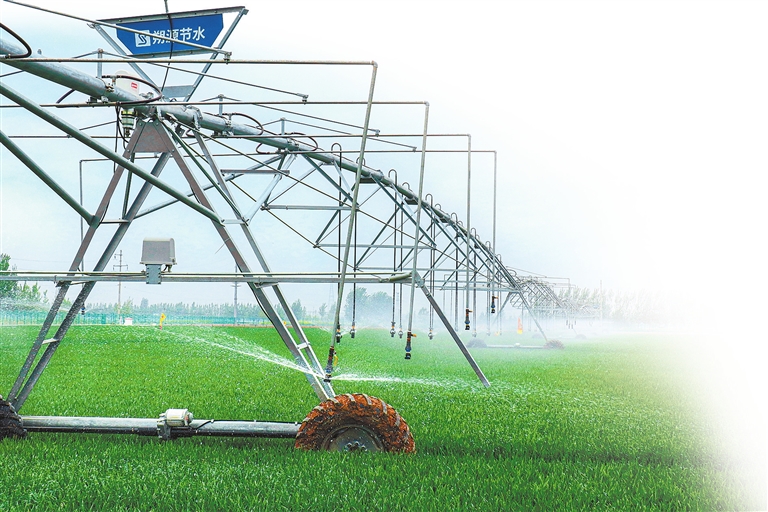 4月14日,河南省提质增产研究院的小麦高产试验田里,节水系统正在对小麦进行微喷。小麦抽穗期肥水需求量大,该院对小麦进行“一喷三防”,为提质增产打下基础。 谷志方 摄