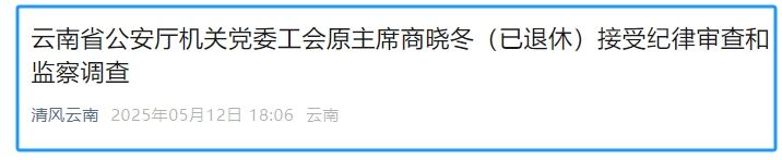 据省纪委监委驻省公安厅纪检监察组、文山州监委消息:云南省公安厅机关党委工会原主席商晓冬(已退休)涉嫌严重违纪违法,目前正接受省纪委监委驻省公安厅纪检监察组纪律审查;经云南省监委指定文山州监委管辖,正接受文山州监委监察调查。