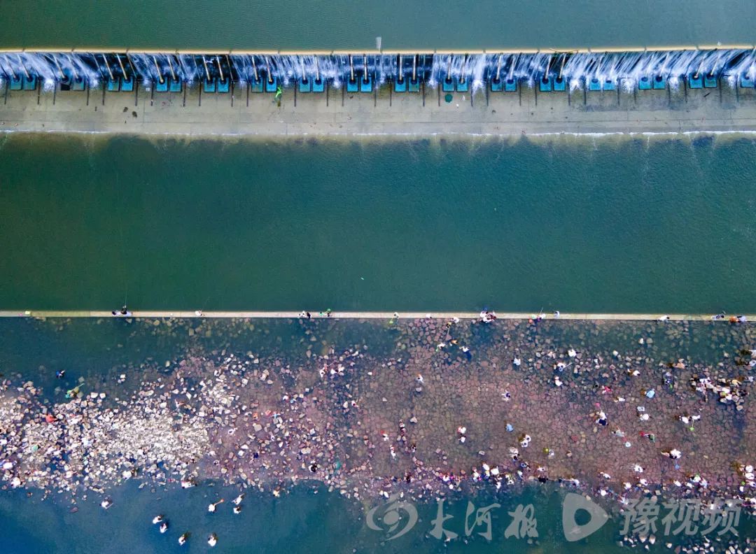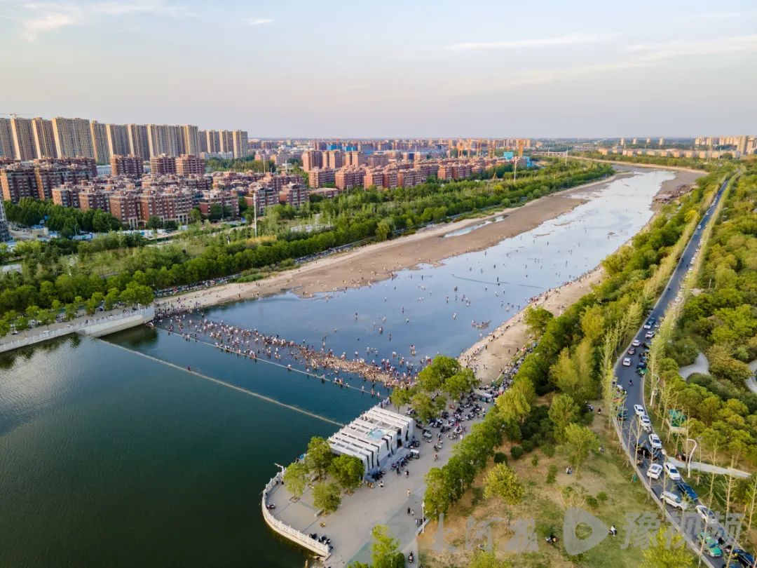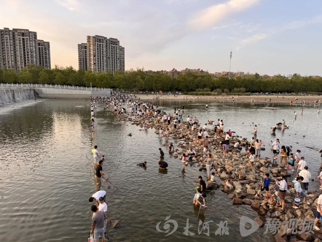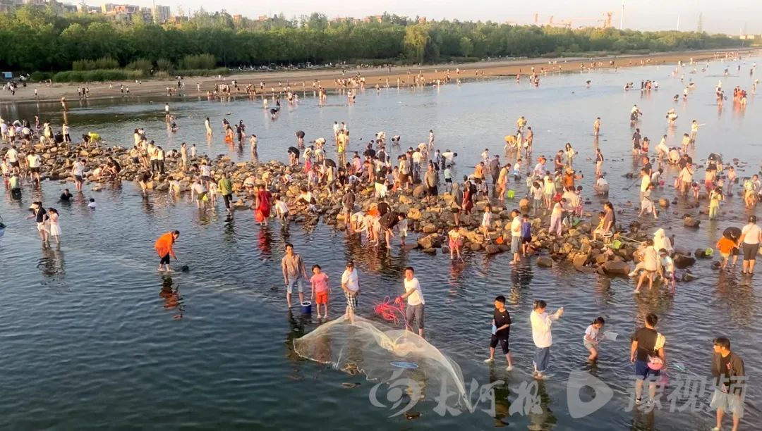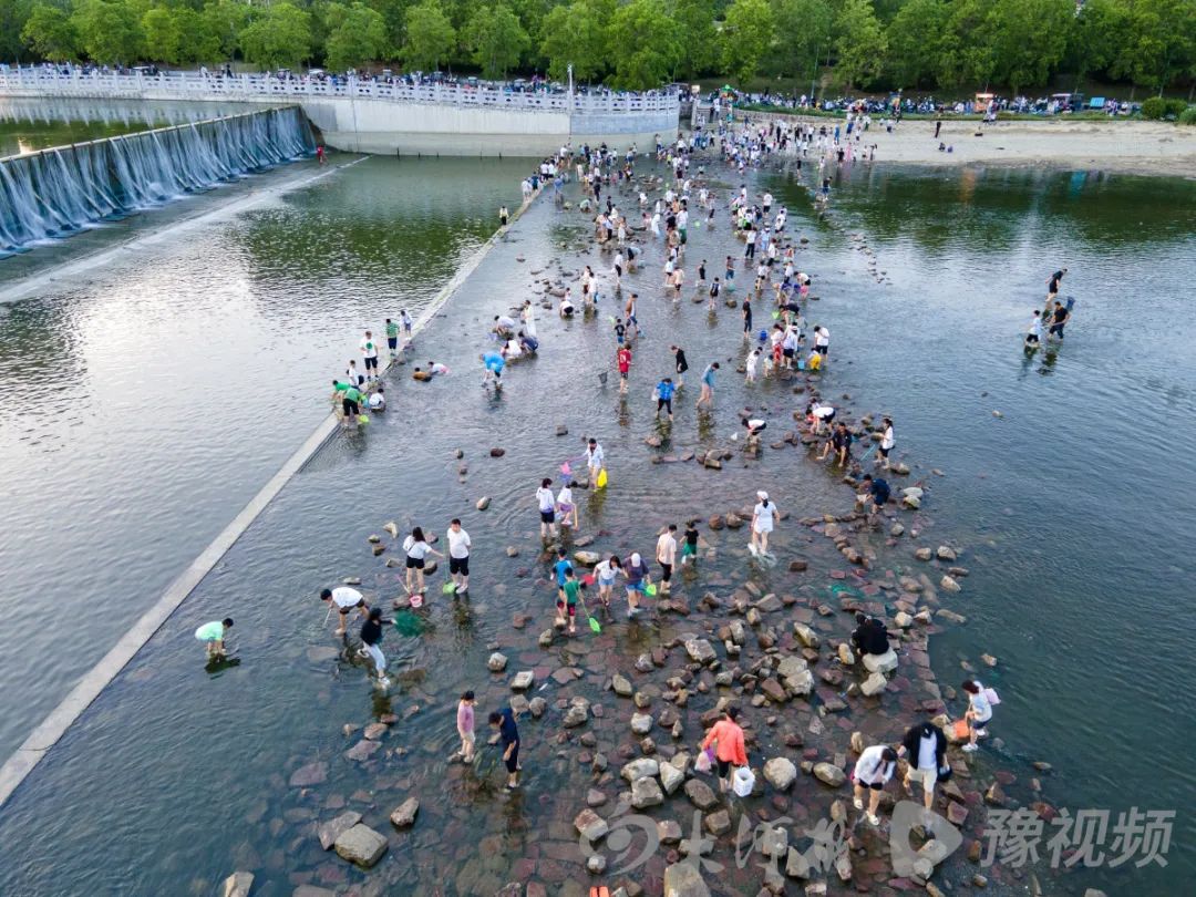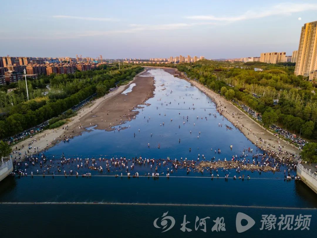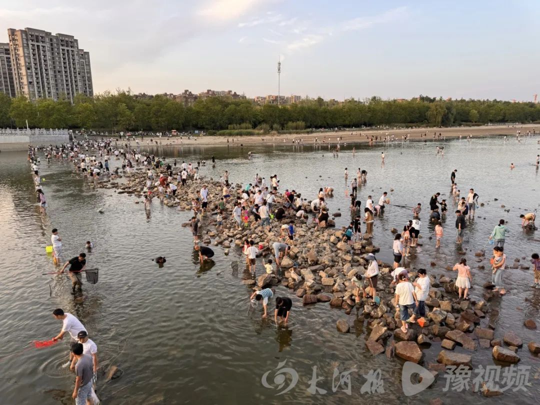 5月11日傍晚,在郑州市文化路北段的贾鲁河东边500米处的拦河坝下面,数百人踩着浅水在河道上玩耍、摸鱼,有的还拿着工具撒网捕鱼,好不热闹。