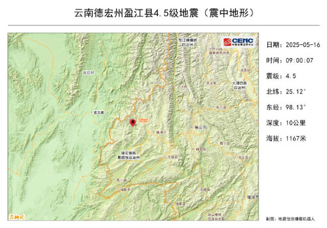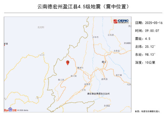 中国地震台网正式测定:05月16日09时00分,在云南德宏州盈江县(北纬25.12度,东经98.13度)发生4.5级地震,震源深度10千米。据盈江县宣传部消息, 目前暂未收到人员伤亡消息。
