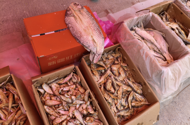 只见一筐筐晒干的咸鱼,通体暗红油亮,摆在路边,不时有顾客前来询问。