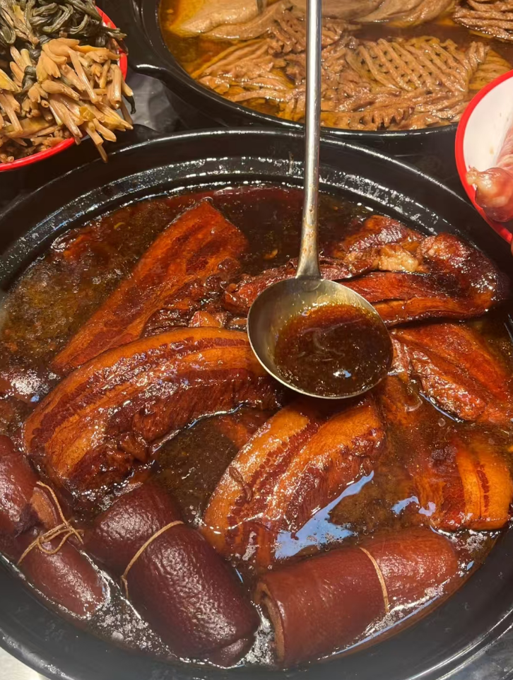 “把子肉”用麻绳捆扎,表皮色泽鲜亮,久炖后醇香扑鼻,待盛到盘里,一位食客忍不住当时就要大快朵颐,看我们拍照,他笑了笑,夹起一块把子肉,在镜头前亮了亮。