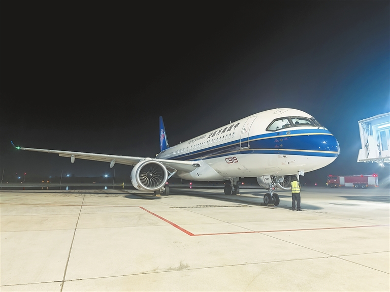 6月4日晚,首航并执飞广州至南阳的C919飞机平稳降落在南阳姜营机场停机坪。 本报记者 司马连竹 摄