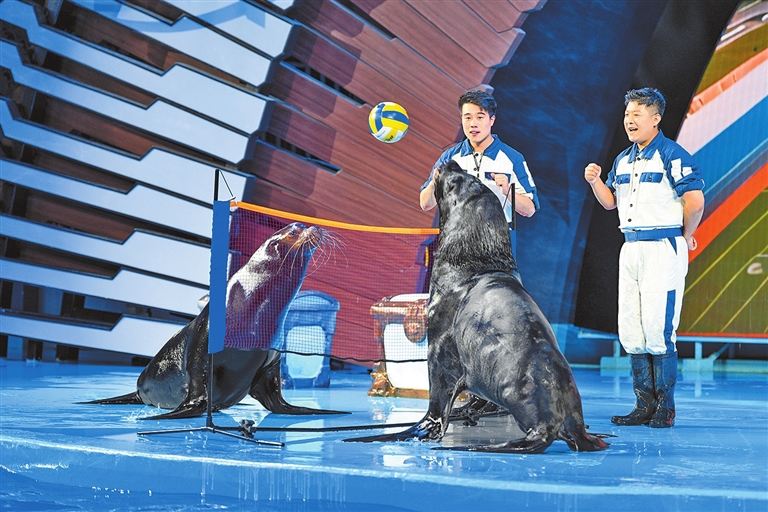 在郑州海昌海洋公园,《海豚奇幻秀——“豫”见海洋》正进入高潮。伴随着箜篌演绎的《大鱼海棠》,3只海豚跃出水面,尾鳍划出完美的弧线。