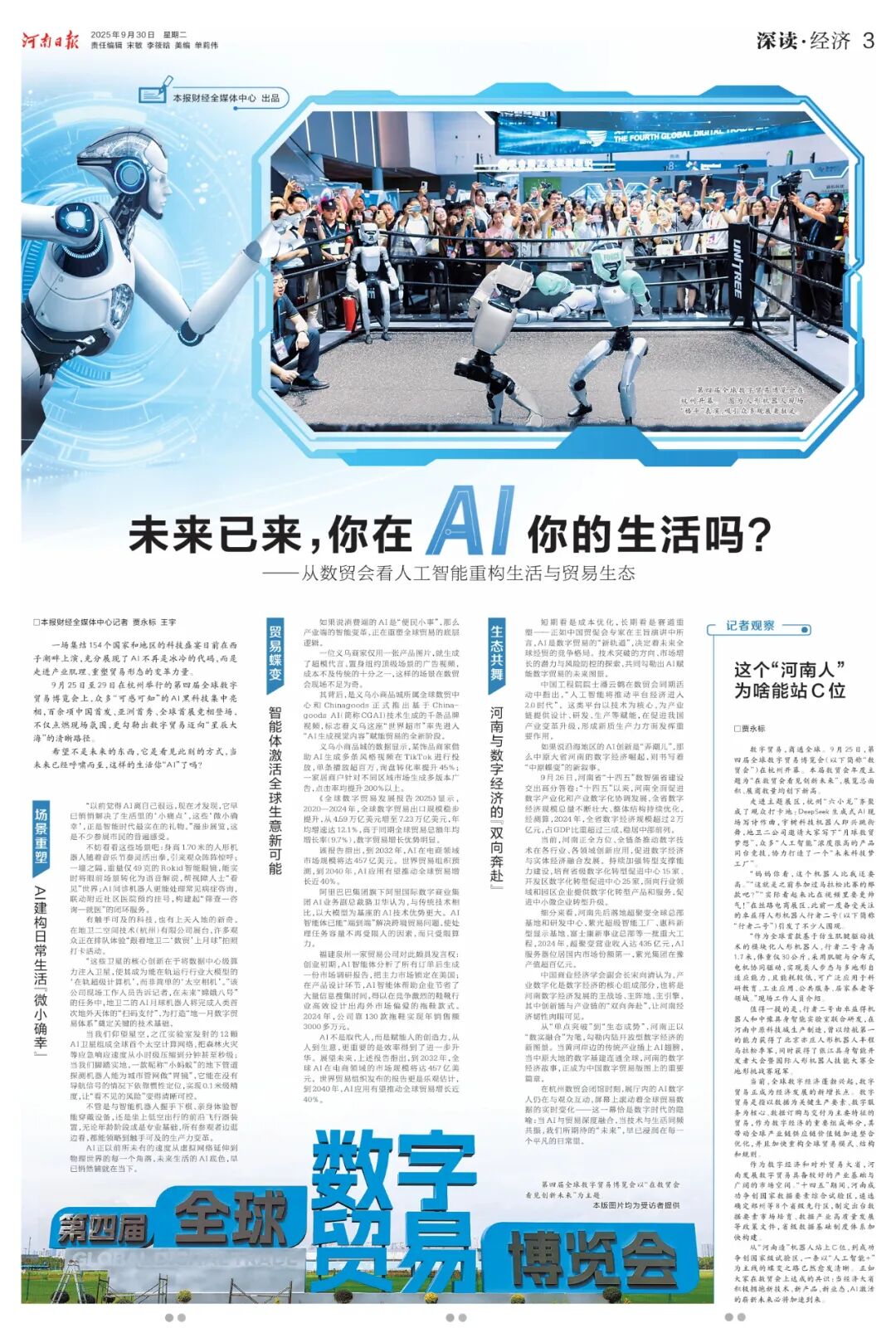 在杭州数贸会闭馆时刻,展厅内的AI数字人仍在与观众互动,屏幕上滚动着全球贸易数据的实时变化——这一幕恰是数字时代的隐喻:当AI与贸易深度融合,当技术与生活同频共振,我们所期待的“未来”,早已浸润在每一个平凡的日常里。(河南日报社财经全媒体中心记者 贾永标 大河财立方记者 王宇)