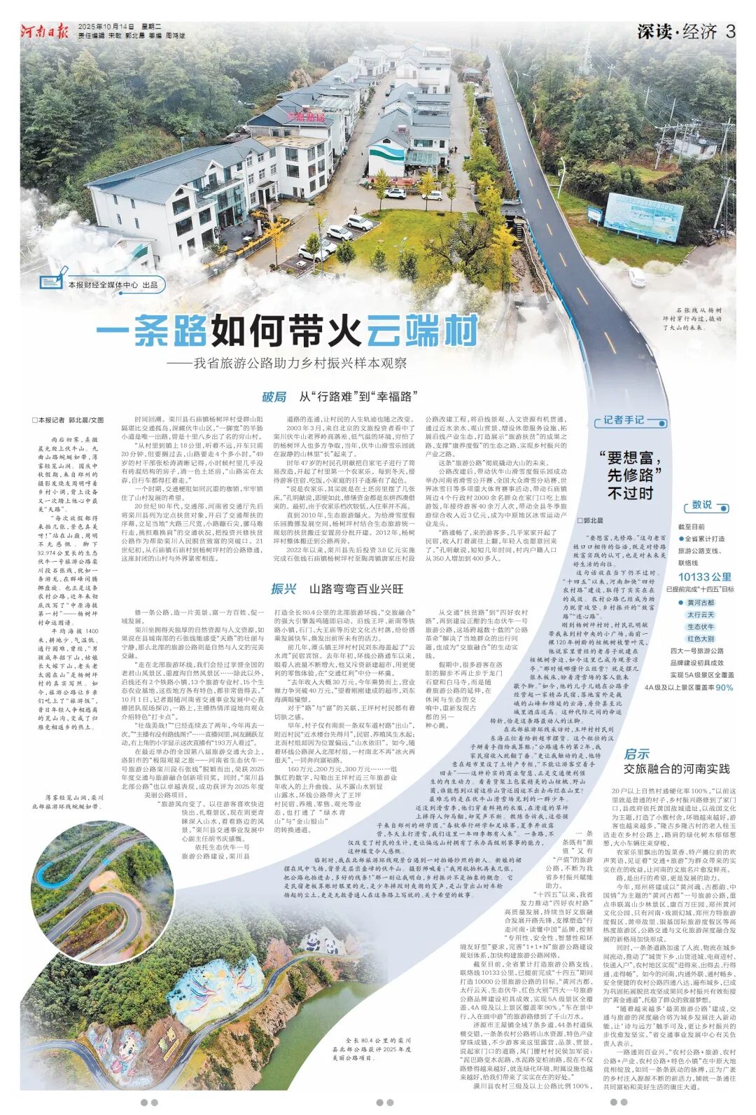 农家乐里飘出的饭菜香、特产摊位前的欢声笑语,见证着“交通+旅游”为群众带来的实实在在的收益,让河南的文旅名片愈发鲜亮。