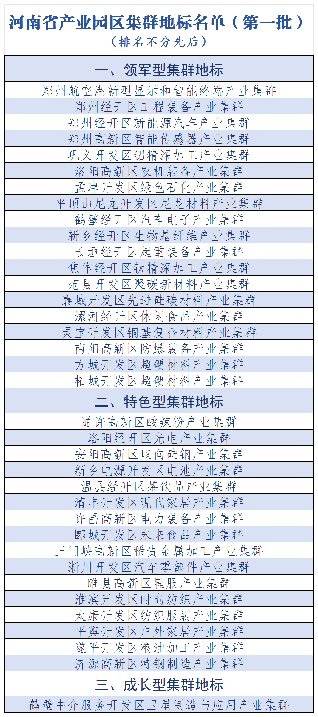 地标名单共分为三个类型,分别是由郑州航空港新型显示和智能终端产业集群等构成的领军型集群地标,由通许高新区酸辣粉产业集群等构成的特色型集群地标,以及由鹤壁中介服务开发区卫星制造与应用产业集群构成的成长型集群地标。