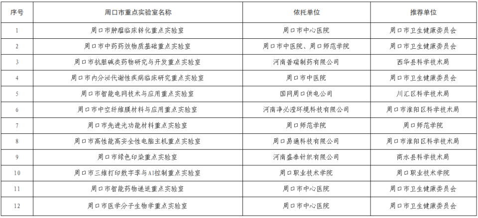 根据《关于开展2025年度周口市重点实验室建设的通知》(周科〔2025〕41号)文件要求,经主管部门推荐、专家评审等程序,周口市科技局拟认定周口市肿瘤临床转化重点实验室等12家实验室为周口市重点实验室(详见附件)。现予以公示,公示期5天(12月1日—12月5日)。