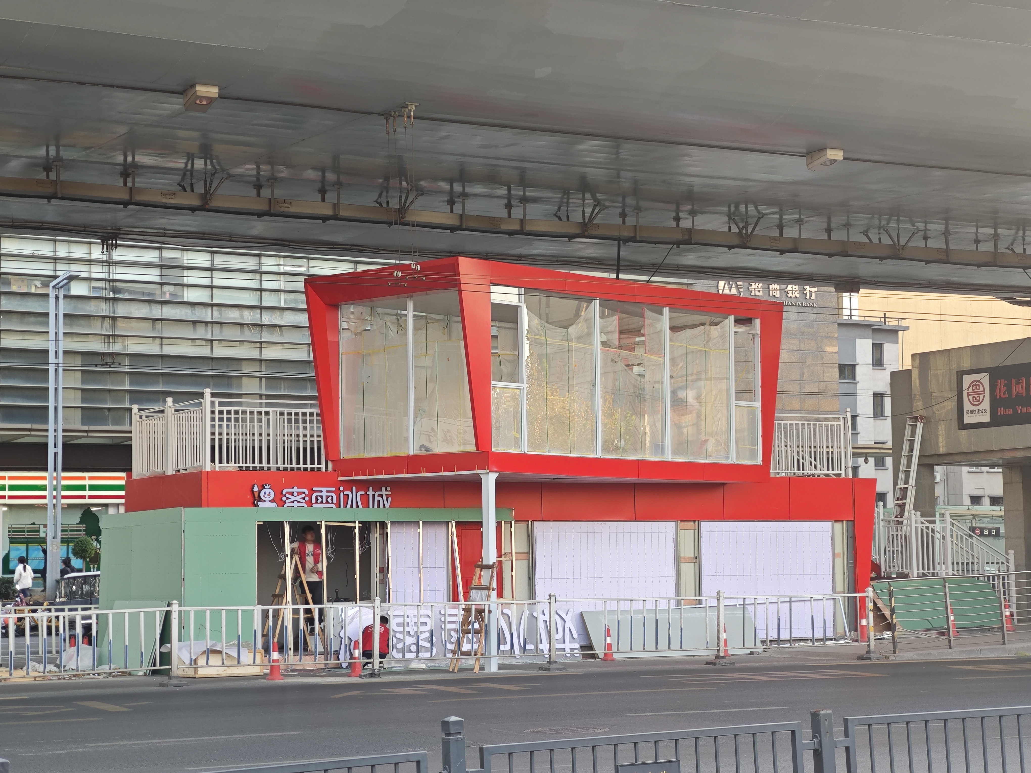 记者到达时,现场的装修工作正在紧锣密鼓地进行中。从外观上看,整体的主体结构已经基本成型,红白配色的装饰风格十分具有辨识度。