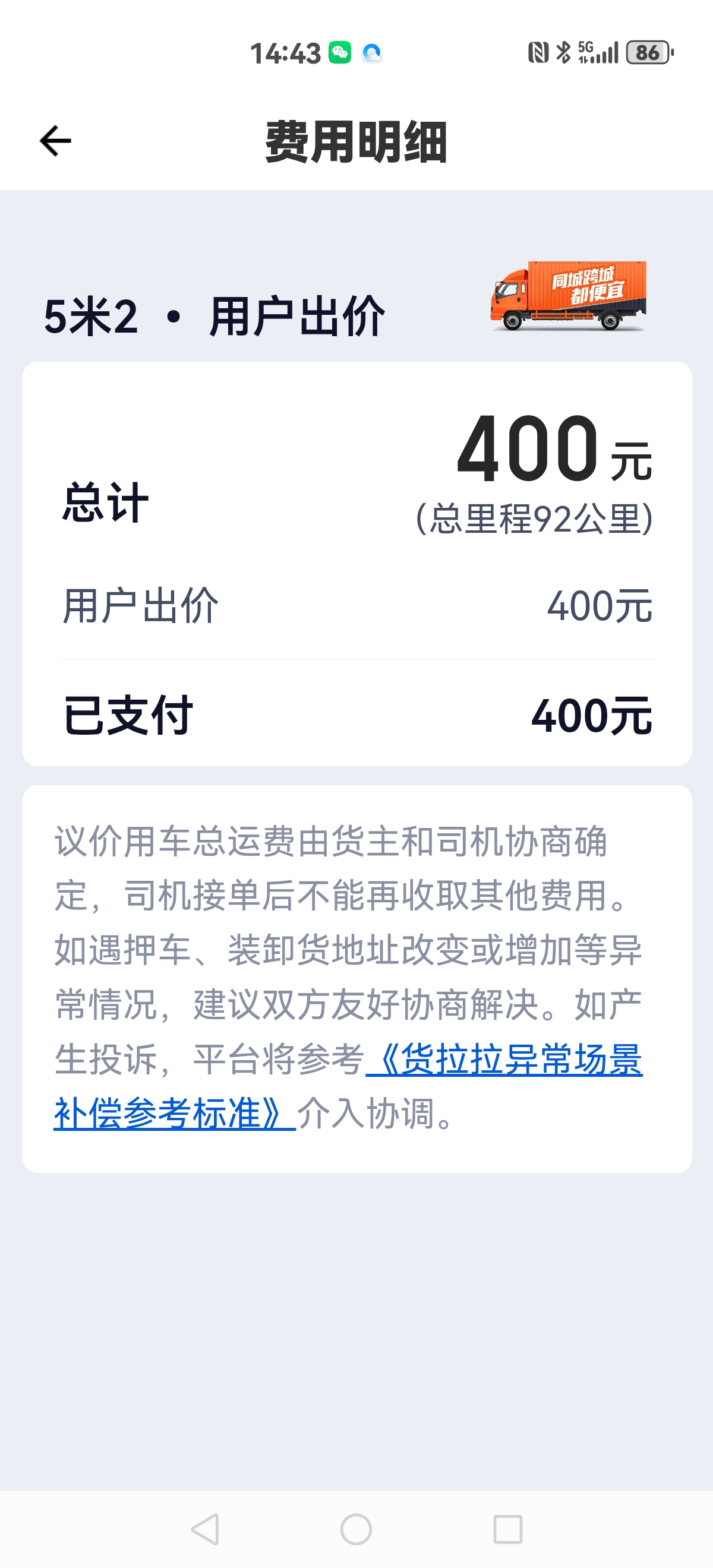 为核实情况,采访中,邻妹妹辗转联系上了当时的货主张先生。张先生说,当时是他下的单,下的400元,司机想让他再加点钱,他才知道司机在平台上看到的是363元。“前两天,我还在平台上投诉了,这弄得不合适,我下的是400元,有什么费用可以标示清楚,不能说客户只给360啊!”