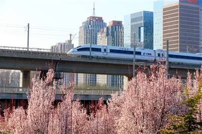 高铁疾驰而过,与沿途的风景交相辉映。