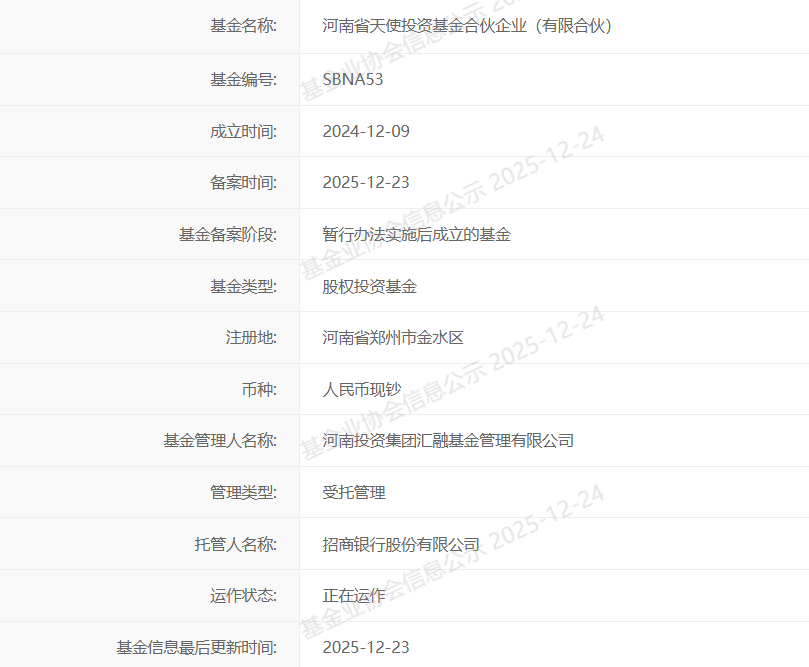 天眼查显示,河南省天使投资基金合伙企业(有限合伙)成立于2024年12月,出资额10亿元,由河南省财政出资,委托河南投资集团发起设立,带动社会资本更多投向河南省种子期、初创期等天使类项目的天使母基金。