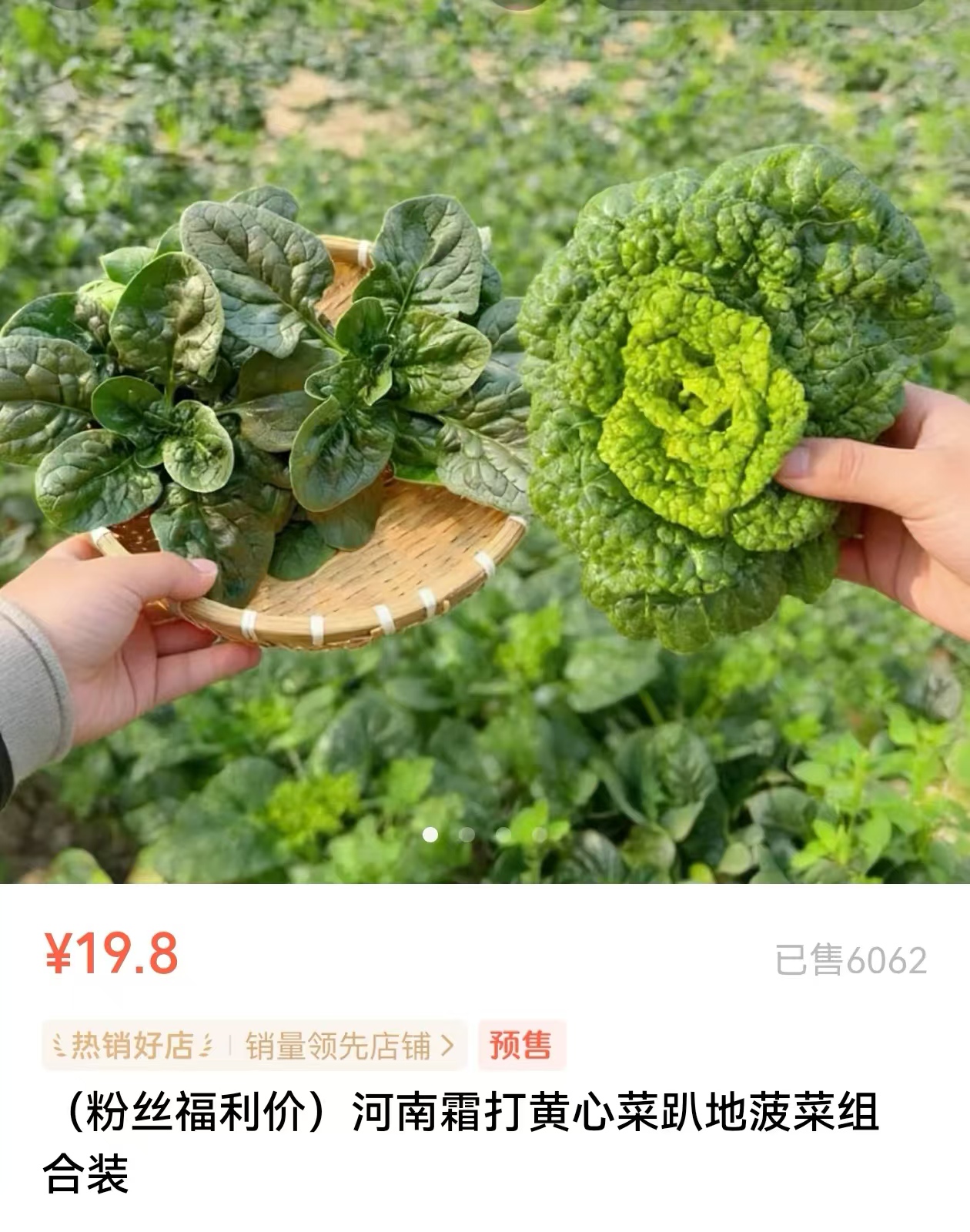 1月12日中午,记者在“河南-小齐同学”的直播间看到,不断有人下单,还有人留言“看到新闻来支持了”,主播连声道谢,直播间预售的,除了趴地菠菜之外,还有霜打黄心菜、本土红皮紫皮蒜苗等,有每种蔬菜对应的不同链接,还有河南霜打黄心菜、趴地菠菜“组合装”。橱窗相关数据显示,已售9万份,跟买人数5万。